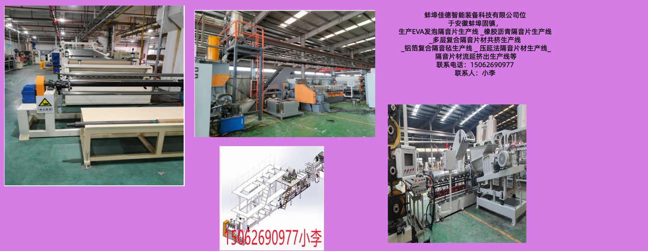 蚌埠佳德智能装备科技有限公司位于安徽蚌埠固镇, 生产EVA发泡隔音片生产线 _橡胶沥青隔音片生产线_多层复合隔音片材共挤生产线 _铝箔复合隔音毡生产线 _ 压延法隔音片材生产线_ 隔音片材流延挤出生产线等···集智能装备制造与隔, 成熟工艺保障品质。诚邀各界伙伴实地考察,携手合作,共赢发展。